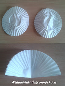 Ahora dibujamos un pétalo en la parte que nos queda doblada y la recortamos. Eso se hace con un mínimo de 3 moldes de magdalenas. Nosotras lo hicimos en tres, pero quedará mejor seguramente si se hace con más moldes.